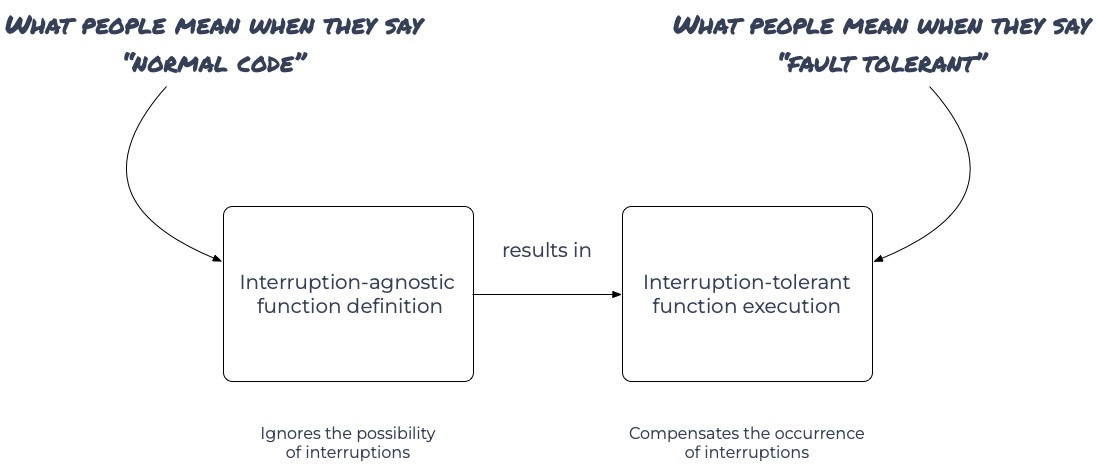According to this definition, “normal code” refers to function definitions that are interruption-agnostic i.e. do not account for the possibility of interruptions while “fault-tolerant” refers to function executions that are interruption-tolerant i.e. compensate for the occurrence of interruptions and show the same observable behavior whether interruptions occur or not.