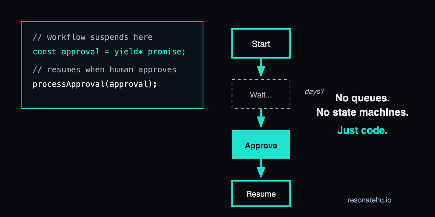 That `yield* approvalPromise` line can pause for hours. Days. Weeks. The function suspends execution, and resumes exactly where it left off when the promise resolves.